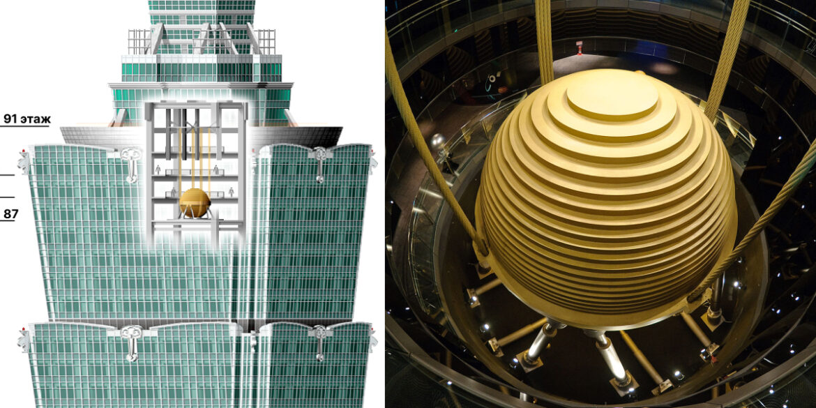 Помимо основания, демпферы размещают и в самом здании. Пример использования этого способа — небоскреб Тайбэй 101 в городе Тайбэе на острове Тайвань. Это здание имеет высоту 509 метров, усиленный фундамент со сваями в скальном основании, мощные бетонные колонны и гибкий стальной каркас в самой конструкции, а между 87 и 91 этажами расположен маятниковый демпфер на тросах. Его вес составляет 660 тонн, и он рассчитан на сильное землетрясение, ну а пока успешно справляется с колебаниями, которые возникают во время мощных тайфунов.