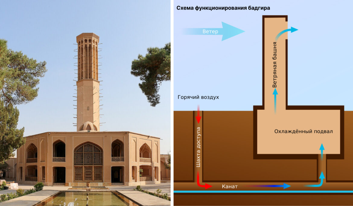 - Башни-бадгиры. Похожие башни, хотя и более простой конструкции, существовали еще в Древнем Египте. Бадгир же ассоциируется в первую очередь с персидской архитектурой. Бадгир – гениальное инженерное решение, которое позволяет охлаждать помещение при помощи вентиляции. По своей сути это высокая башня с воздушными каналами, основание которой находится в глубине здания, а верхняя часть, ветроуловитель, возвышается над строением. Через башню в систему вентиляции поступает ветровой поток, который по системе воздуховодов проникает в нижние части здания, охлаждается под землей и поднимается наверх, пронося прохладу через все строение.