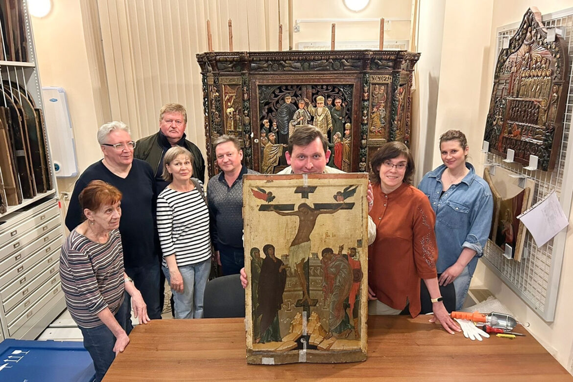 Все началось осенью 2023 года, когда на аукцион предметов искусства – Hargesheimer Kunstauctionen в Дюссельдорфе – попала старинная русская икона с изображением Распятия. Сотрудники Новгородского государственного объединенного музея-заповедника, просматривавшие сайт аукциона, застыли в изумлении: несомненно, это была та самая икона. О неожиданной находке поспешили оповестить руководство. «Не думал, что в таком удастся поучаствовать, но это невольно произошло, – вспоминает Сергей Павлович Брюн, генеральный директор Новгородского музея. – 17 октября, на пятнадцатый день моего директорства, ко мне пришел главный хранитель и сказал, что в Германии нашлось наше Волотовское Распятие…»