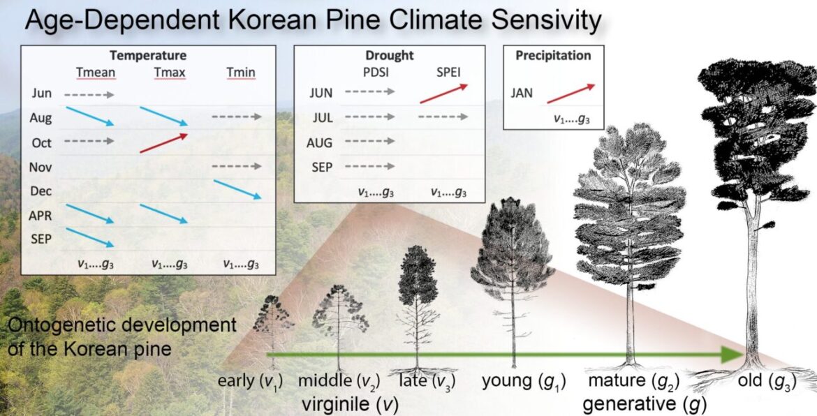 Исследователи ФНЦ биоразнообразия наземной биоты Восточной Азии РАН показали, что реакция кедра корейского (Pinus koraiensis) на климат существенно меняется с возрастом и онтогенетической стадией — от подроста до старовозрастных деревьев. Работа выполнена на юге Сихотэ-Алиня (Верхнеуссурийская станция), проанализированы 191 керн и создано шесть хронологий по стадиям развития дерева. Это позволило точнее «увидеть» климатический сигнал в годичных кольцах и избежать смешения эффектов возраста, размера и статуса кроны.