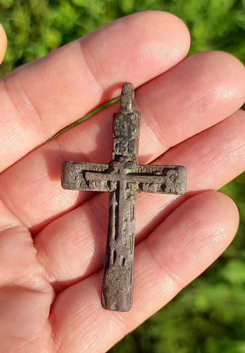 Злосчастный курган, как выяснилось, грабили по меньшей мере четыре раза. В шурфе были обнаружены выброшенная керамика, ружейный кремний, остатки упряжи из железа, а один наш предок в пылу грабежа даже оставил во рву бронзовый мужской нательный крест, что подтвердило версию о национальности и вероисповедании бугровщиков.