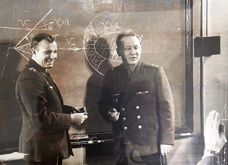 Вот фотография, на которой Ю.Гагарин защищает диплом перед С.Белоцерковским. Тут же фото, где космонавт Александр Серебров, выпускник МФТИ, дарит ректору О.Белоцерковскому на юбилей свою перчатку от скафандра.