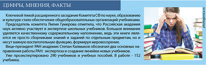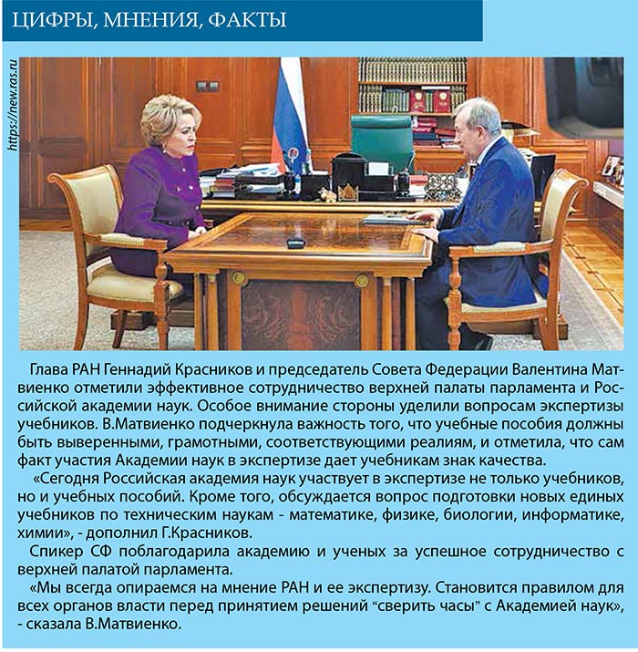 На недавней встрече В.Матвиенко с президентом РАН Г.Красниковым спикер верхней палаты подчеркнула важность того, что учебные пособия должны быть выверенными, грамотными, соответствующими реалиям, и отметила, что сам факт участия Академии наук в экспертизе дает учебникам знак качества.