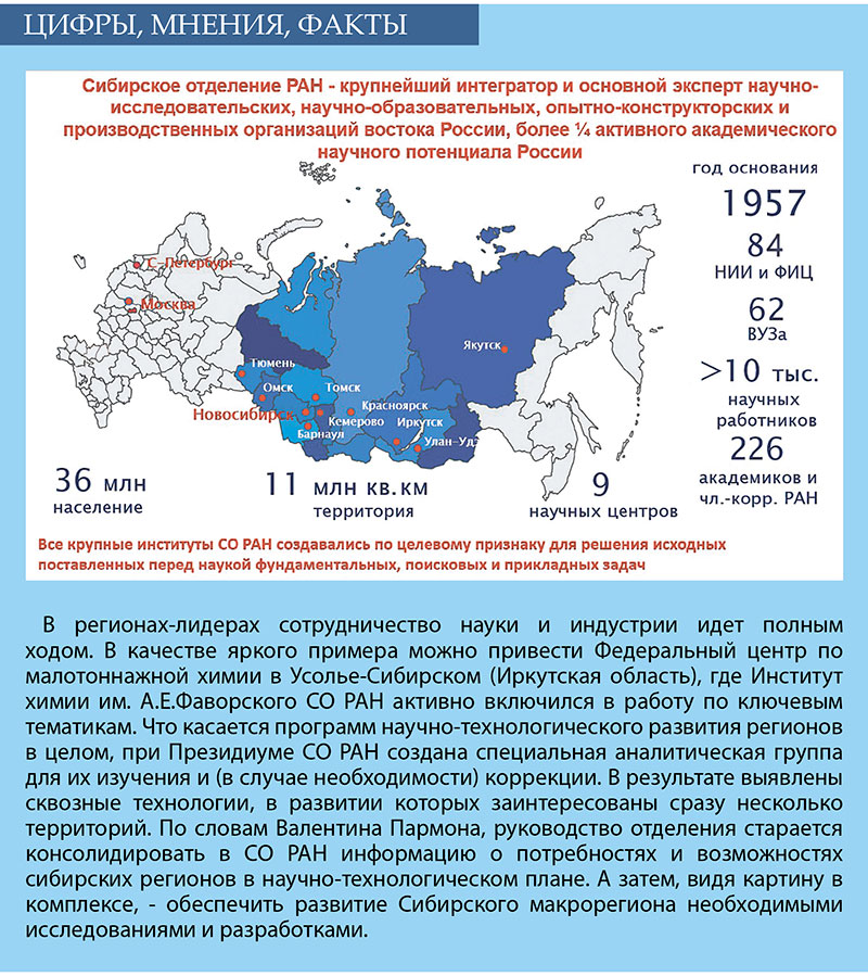 Масштаб впечатляет: территория в 11 миллионов квадратных километров, от Тюмени до Якутска, где сосредоточено более четверти научного потенциала России - 78 академических институтов и 62 вуза. Вот за какой макрорегион отвечает Сибирское отделение РАН. С годами знаменитый треугольник «наука - кадры - производство», придуманный академиком Михаилом Лаврентьевым, превратился в более устойчивую геометрическую фигуру - тетраэдр. Четвертой вершиной стала региональная власть. Причем формы сотрудничества с регионами самые разнообразные. В прошлом году, например, Алтайский филиал СО РАН возник на базе… академического собрания. Комментирует председатель СО РАН, вице-президент РАН академик Валентин ПАРМОН: