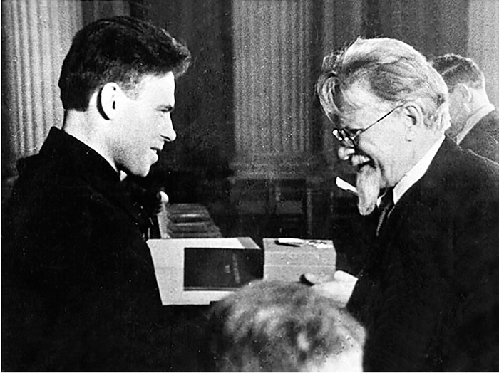 «Всесоюзный староста» М.И.Калинин вручает в Кремле молодому геологу-нефтянику А.А.Трофимуку орден Ленина и золотую медаль Героя Социалистического Труда, 1944 год. Фото: sbras.info