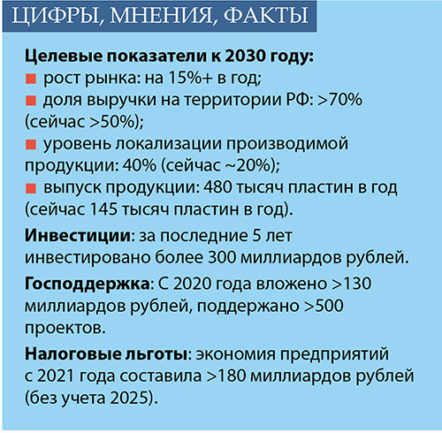 Были озвучены амбициозные, но конкретные цели на ближайшие годы. К 2030 -му планируется увеличить долю выручки, генерируемой на территории России, с нынешних 50% до 70%, а уровень локализации продукции - с 20% до 40%. Выпуск продукции должен вырасти со 145 тысяч до 480 тысяч кремниевых пластин в год. Для этого уже инвестировано более 300 миллиардов рублей, а государство с 2020 года поддержало более 500 проектов на сумму свыше 130 миллиардов.