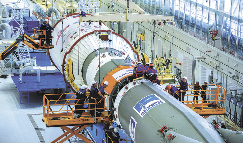Сборка ракеты космического назначения «Союз-2.1б» с космическими аппаратами «Ионосфера-М» №1 и №2 и 53 попутными малыми космическими аппаратами. Фото Космического центра «Восточный» (ЦЭНКИ).