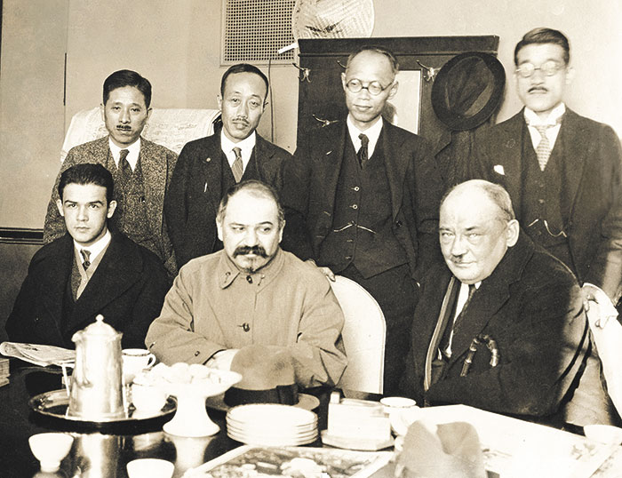 И.М.Майский, драгоман И.Г.Спальвин и сотрудник полпредства Андреев среди японских журналистов и артистов театра «Кабуки» в Токио. 1928 год. Архив РАН.