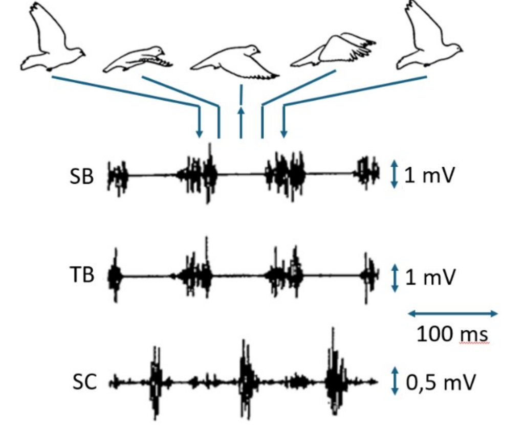 Схема активности мышц во время полёта птицы. Стрелки указывают начало взмаха, направление стрелки соответствует направлению взмаха. Показаны сигналы из передней головки грудной мышцы, задней головки грудной мышцы и мышцы надворотничка (?). K. P. Dial, S. R. Kaplan etc.. J Exp Biol 134:1– 16, 1988.
