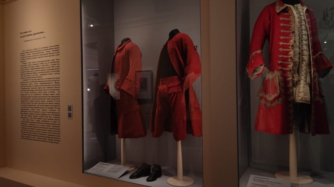 Основу мемориальной экспозиции составляет гардероб Петра I из фондов Государственного Эрмитажа, сильно контрастирующий с привычным образом императора в военном мундире. Светлана Амелёхина, заведующая сектором тканей Оружейной палаты, поделилась, что как куратор она сознательно стремились уйти от стереотипного представления о Петре, показать, каким импозантным он был в реальной жизни. По современным меркам Петр, носивший 50-й размер одежды при росте 2 метра 3,5 сантиметра, имел модельную фигуру!