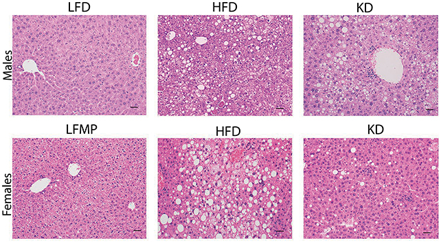 У самцов мышей, получавших кето-диету (крайний справа), были обнаружены признаки жировой дистрофии печени. (Gallop et al., Sci. Adv. , 2025)